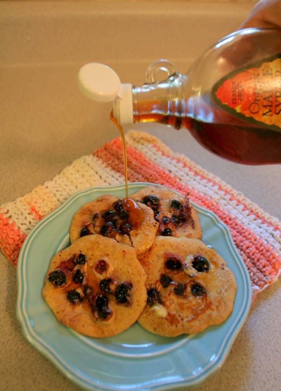 Pour batter (about 1/4 cup for each pancake) into the pan, sprinkle a few blueberries onto each pancake (the first ones to hit the pan may stick, don't lose heart--the second ones go smoother 😉