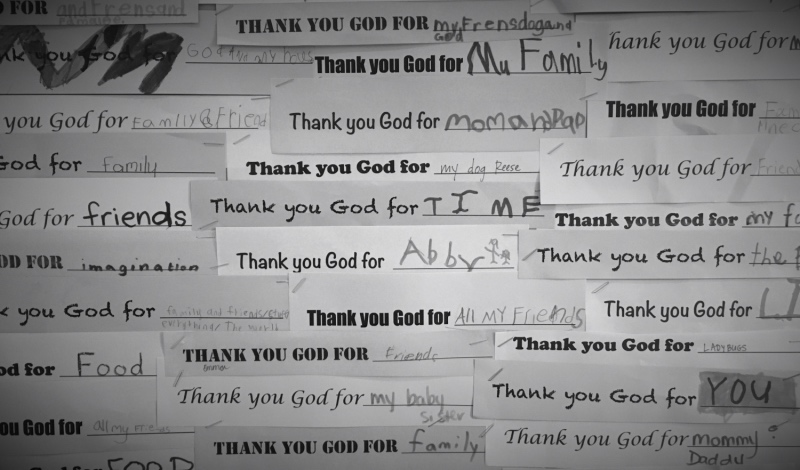 I was stunned, stopped by that small word staring at me. How many times had I passed by it before? I stood in the large room at the center of our childrens’ Sunday school classes. The neon slips had caught my attention, and I stopped to scan the unruly handwriting on each one. “Thank you God for __________”. Children’s gratitude lists filled in the blanks, everything from “family and friends” to “food” to “toys”. I wondered which ones were markered by my own boys.