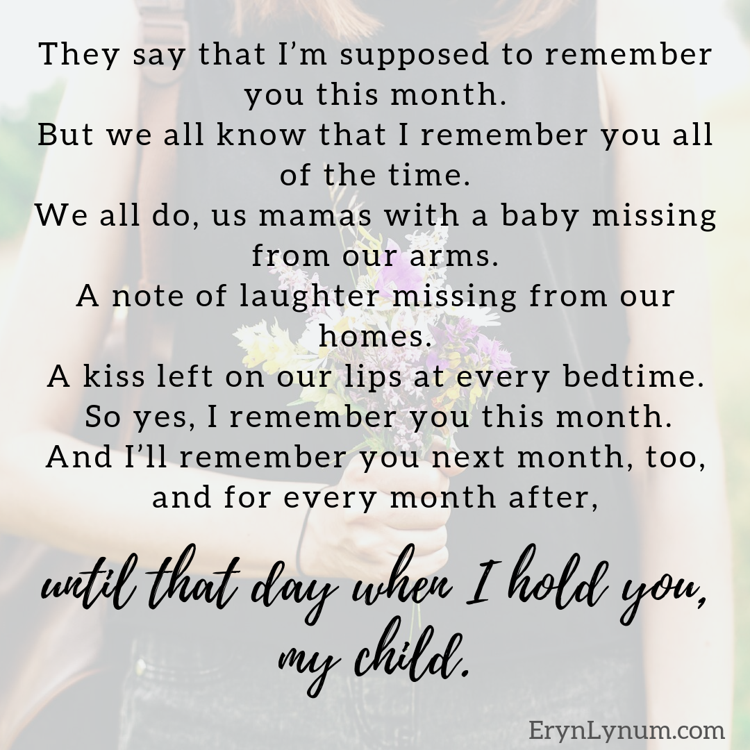 Perhaps it is through words like these that we come to know the child we will never hold this side of Heaven. It’s how I came to know my little one. The one who rests today in the arms of Jesus. The one I remember this month, and every month.