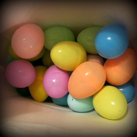 That is when I spot them. Two cellophane sleeves of wonder. They sit at the bottom of a forgotten cart; one of those carts that belonged, at one time, to an employee clearing shelves of misplaced items. Blue, yellow, orange, pink eggs peer through the pile of displaced toys, as if calling out to me “Here we are! You found us!”