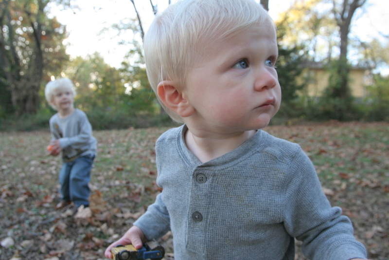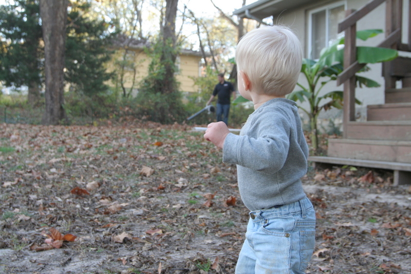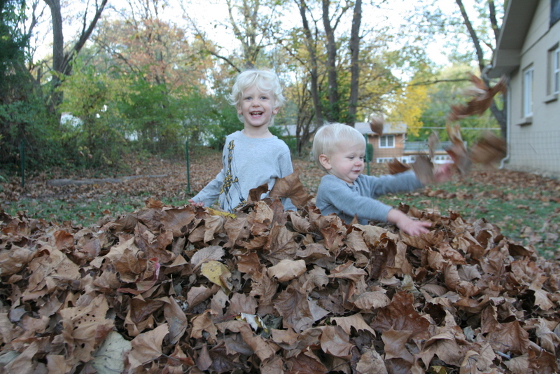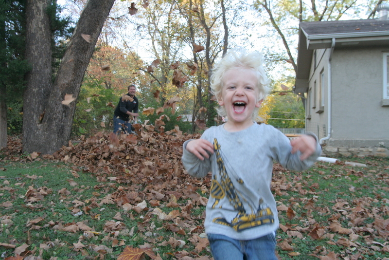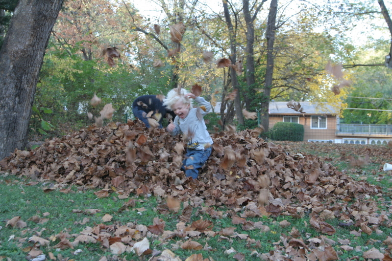 As the brats sizzled over charcoal, he grabbed the leaf blower, and quickly blew our overly abundant supply of fallen leaves into a huge heap. Zeke laughed pure joy as he stampeded through the pile; he laughed even harder as I jumped in. Ellis was apprehensive, this his first experience with leaf jumping, and so I held him near and warm, he welcomed the embrace.