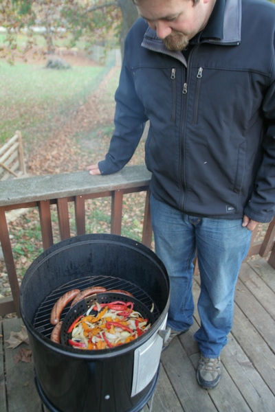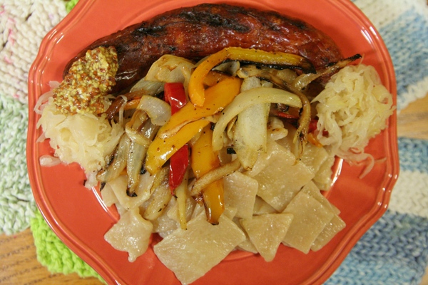 Today I saw it in a home cooked meal. One of our all-time favorites: Grilled brats with onions and peppers (also grilled), alongside of my mom’s dumplings. The preparation was effortless. Early in the day I felt good, really good. I mixed dough, rolled it flat, cut it imperfectly, and tossed the dumplings into the fridge for later. The man came home and lit up the charcoal grill.