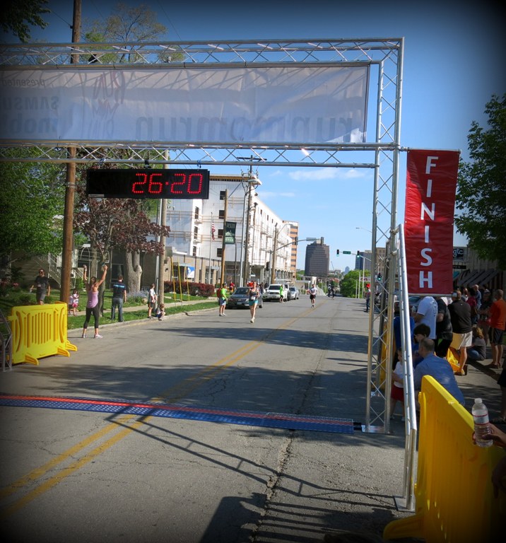 And then I turned right and caught glimpse of the finish line, and under it the red blinking lights indicating time elapsed. My time. But my head was fuzzy, and all I cared about was that I was finally at the finish line, so the time didn’t register, I just began scanning the cheering crowd for my men. And there they were!